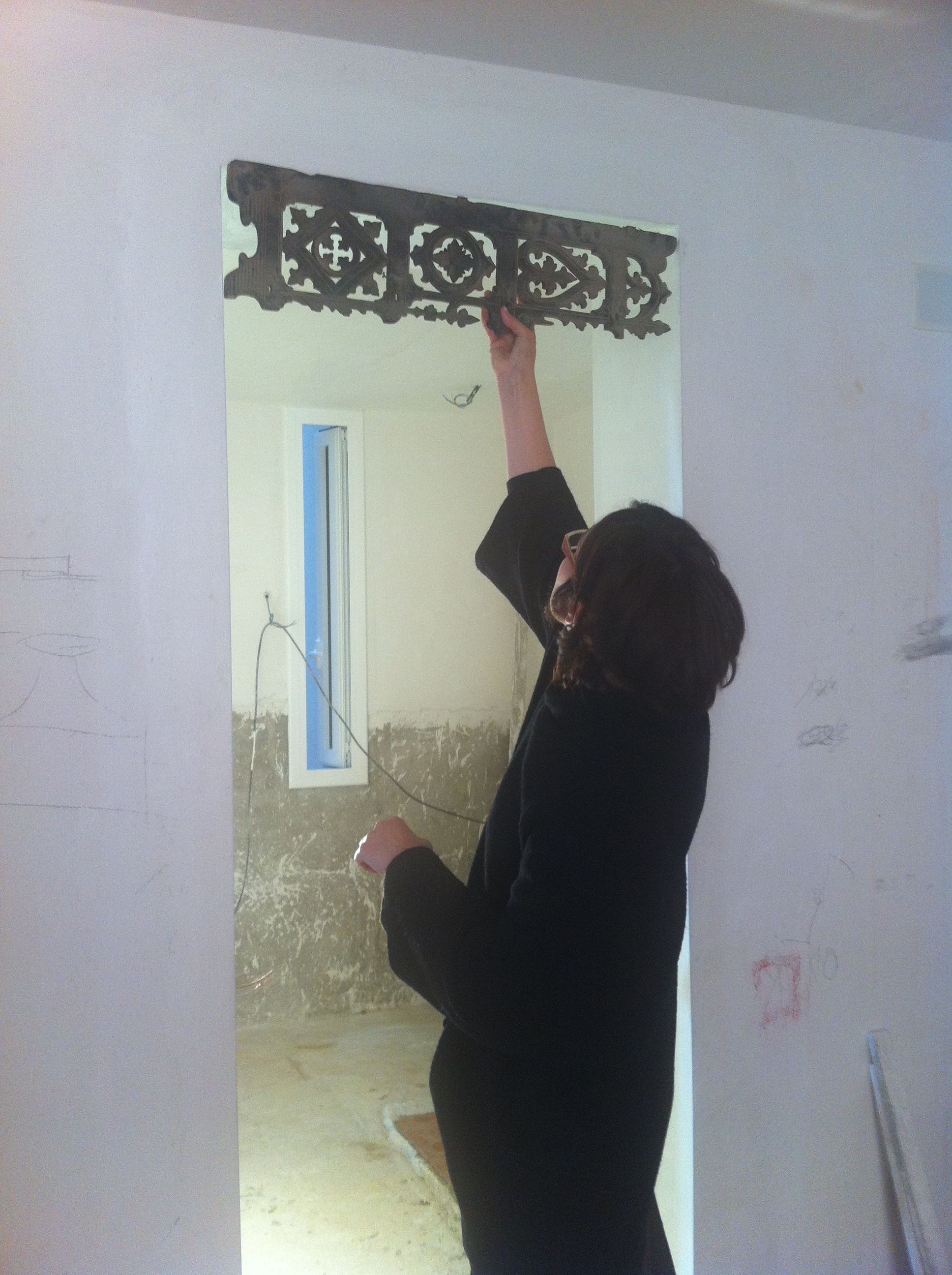 y Ya hemos encontrado el lugar perfecto para esta moldura de madera que Josepa quiere absolutamente reciclar! un detalle muy bonito para el paso entre su habitacion y su baño.