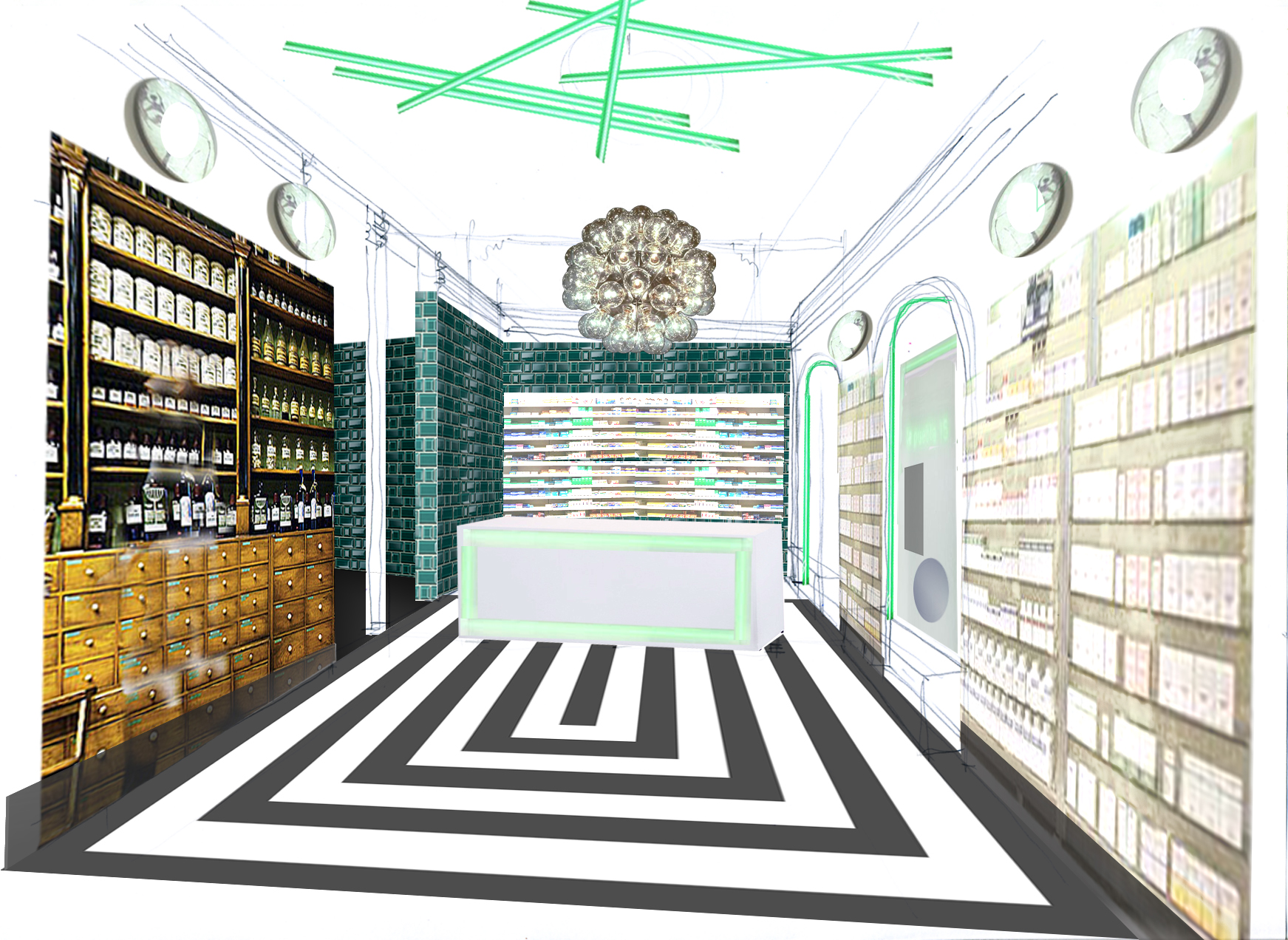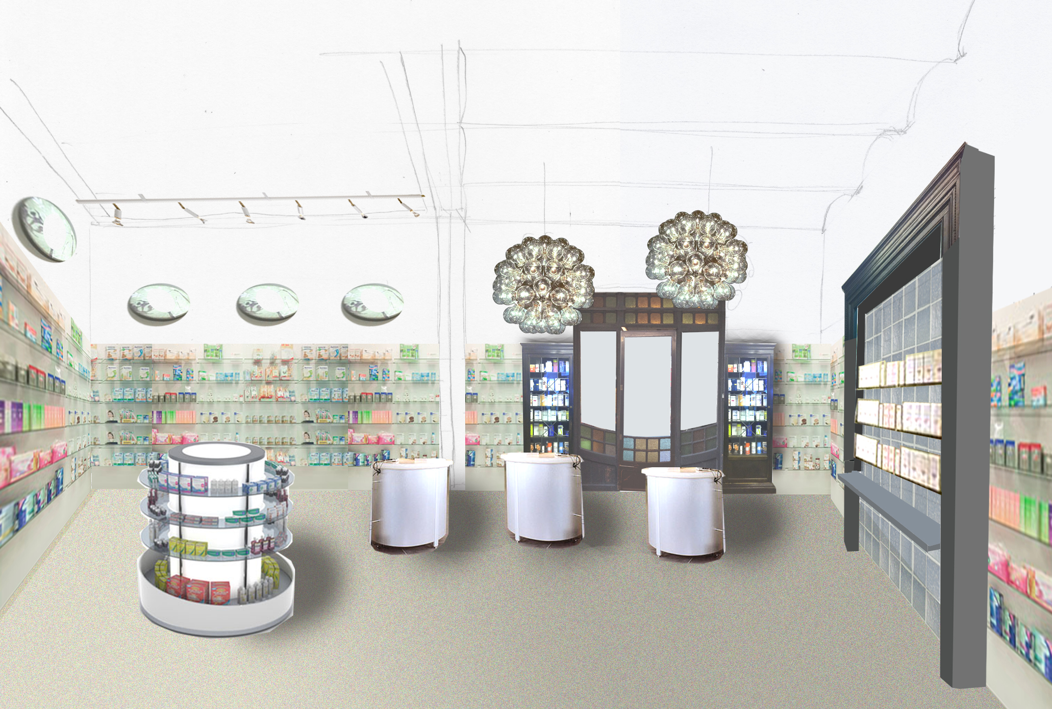 No encanta el encargo, y surgen las primeras propuestas para hacer convivir la personalidad de la farmacia con los objetivos nuevos : muy contemporaneo, y muy antiguo!