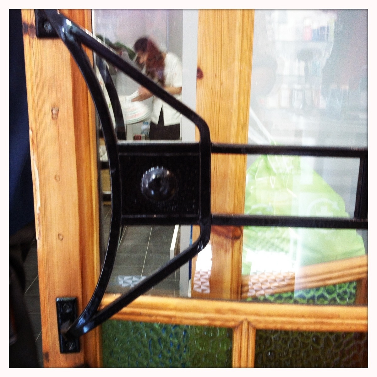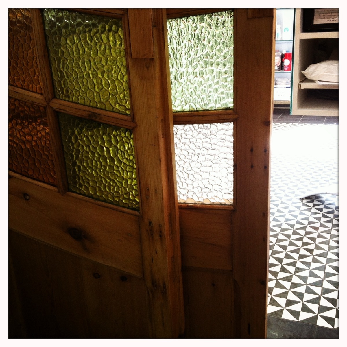 Han colocado el tubo del aire acondicionado, esta ya todo pintado de blanco, los focos iluminan ya los estantes aun provisionales, la puerta antigua de la entrada, decapada y restaurada esta colocada en su sitio. Todo este conjunto funciona muy bien, y las decisiones tomadas cojen relieve!