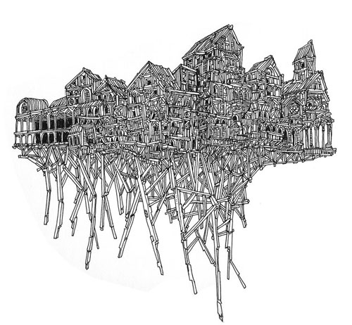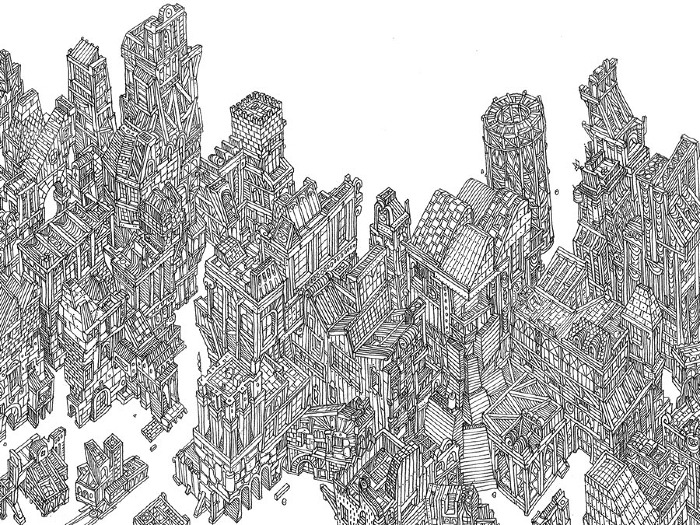 Es hallucinante el proceso de creacion, verle rehacer varias veces el mismo esquema, encontrar las composiciones perfectas, definir exactamente los espacios de dibujo, y admirarle lanzarse a dibujar el trazado definitivo : mas que halucinante, es hipnotico penetrar en su mundo blanco y negro, pasear en estos volumenes amontonados que definen una ciutad entera.
