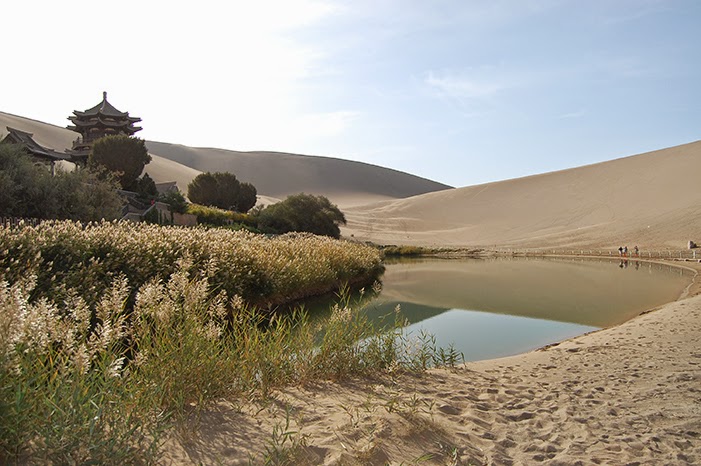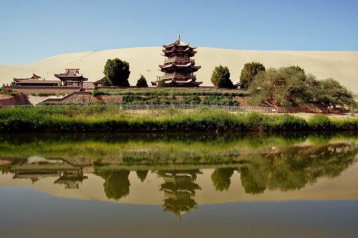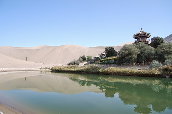 Durante miles de años los peregrinos y comerciantes en la ruta de la seda han utilizado el oasis Crescent Lake como última parada antes de que se enfrenten a las dificultades del desierto de Gobi. A seis kilómetros de la ciudad de Dunhuang el oasis ha perseverado a través de los milenios.