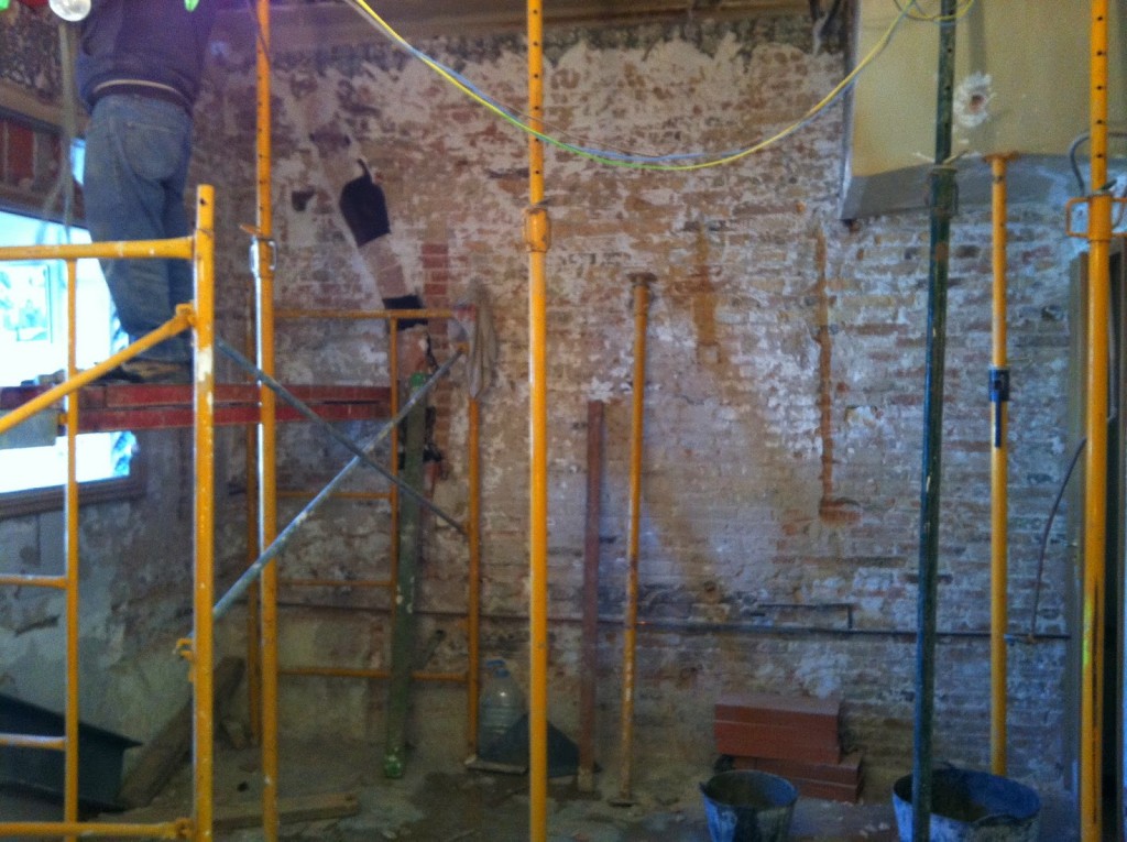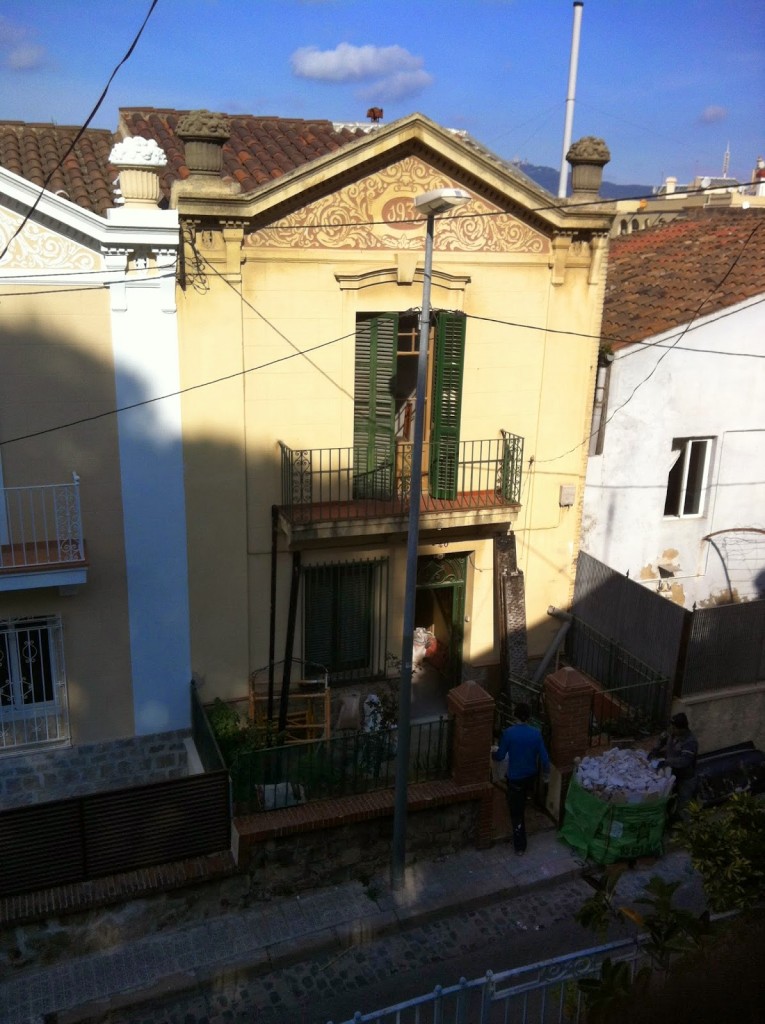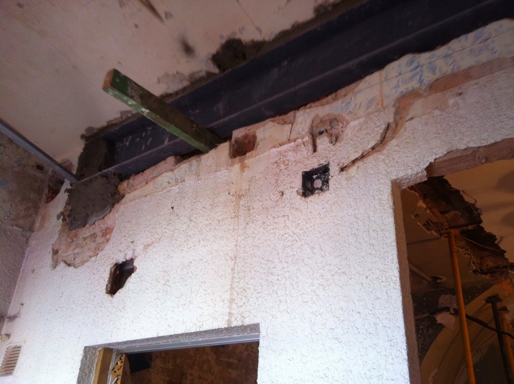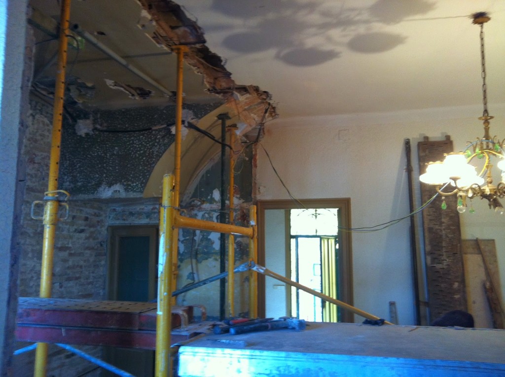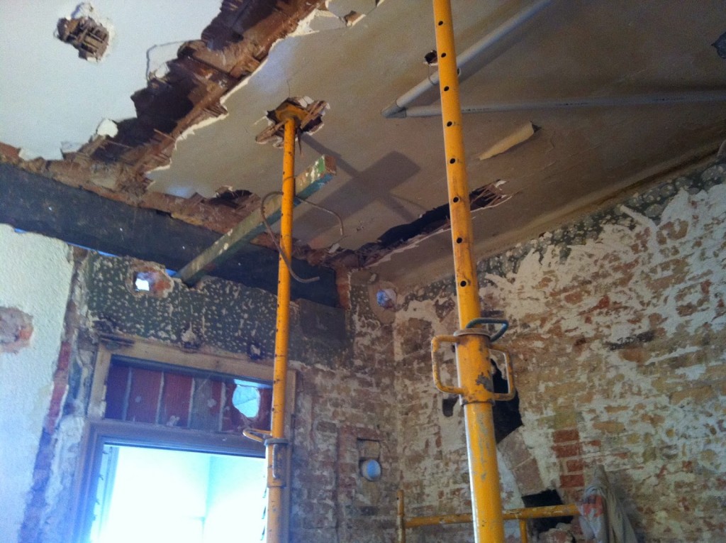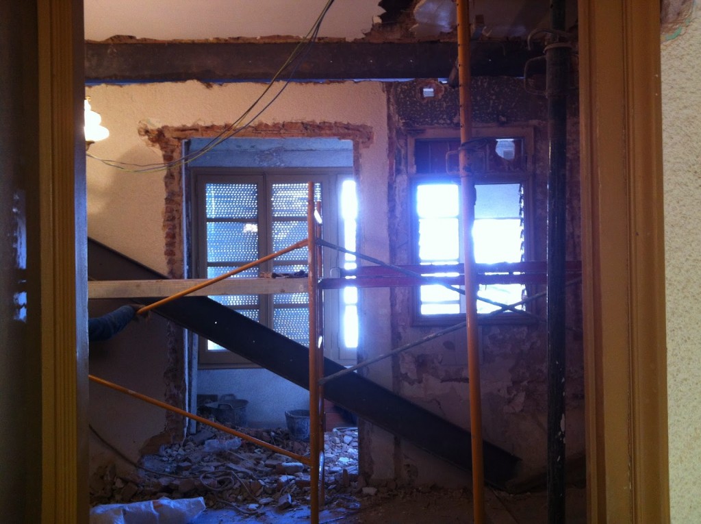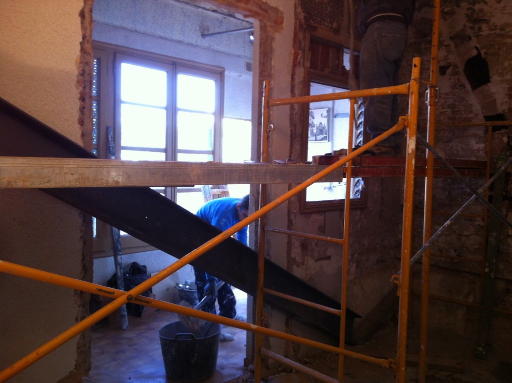 Evidentemente, es la fase donde nuestros clientes estan un poco impresionados : una casa habitable se vuelve ruina por un momento…tecnicamente, estan colocando los apeos que nos permitiran sacar las paredes que molestan la entrada de luz. Unos Señores apeos que calculo nuestro arquitecto!