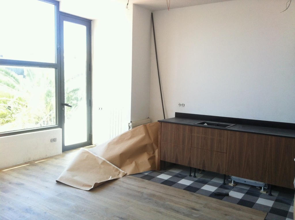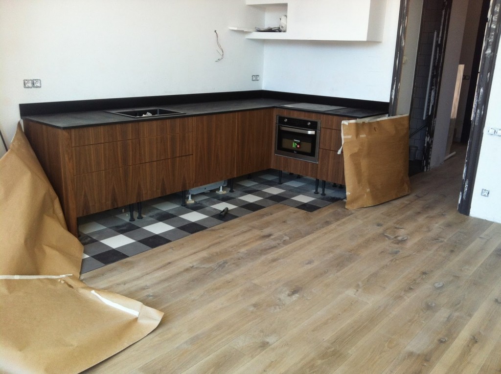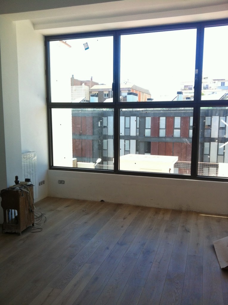 Hace un monton de tiempo desde entonces, el ventanal esta colocado (no sin varias idas y vueltas de los instaladores, para dejarlo PERFECTO), la cocina esta instalada, las luces de los baños funcionan, la sala de cine esta pintada, y esta mañana….acabaron de colocar el parquet!!!