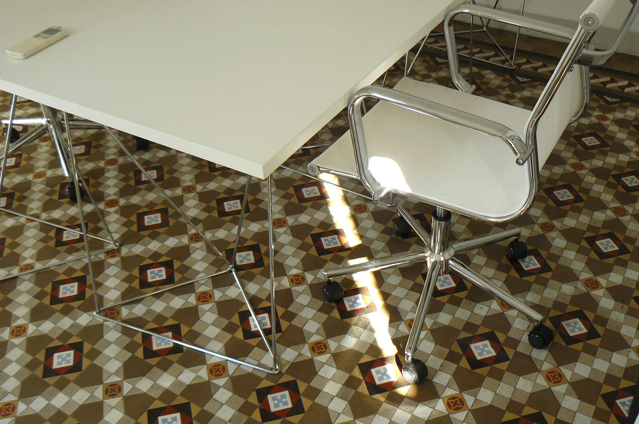 Aqui, nos piden instalar una oficina, pero que no sea «demasiado oficina». El resultado es una intervencion muy minimum, con un mobiliario bien escogido, que no haga competencia al suelo, sino que lo ponga en valor.